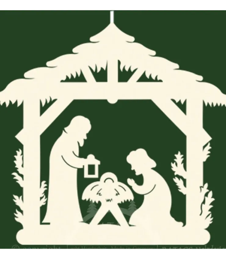 Décoration De Noël A Suspendre, Crèche En Bois Découpe.Avec Une Scene De La Nativite : Enfant Jesus, Marie Et Joseph…