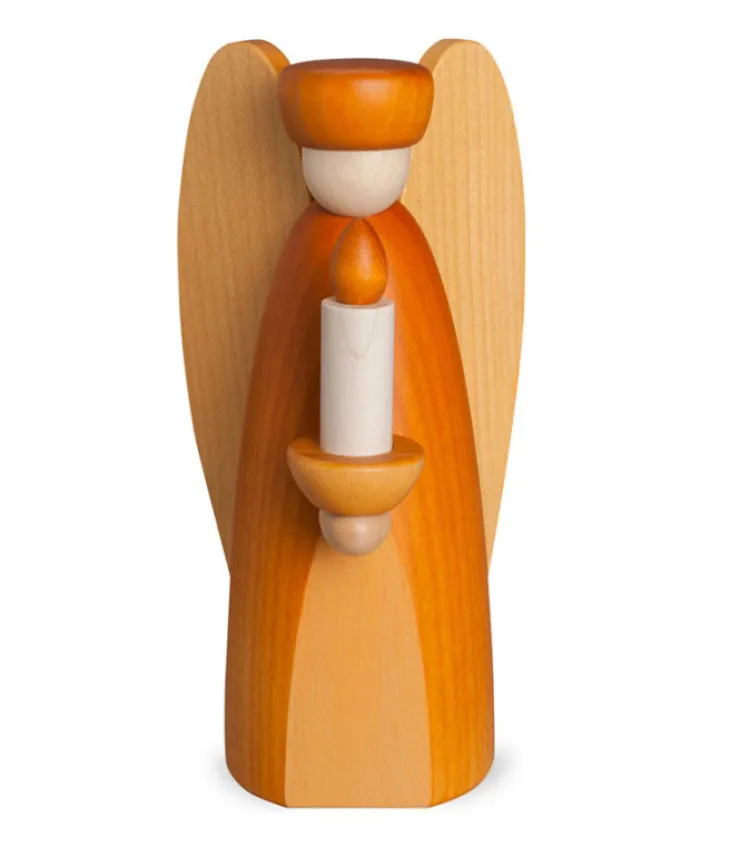 Ange De Noël Couleur Jaune Avec Une Bougie En Bois Entre Ses Mains.