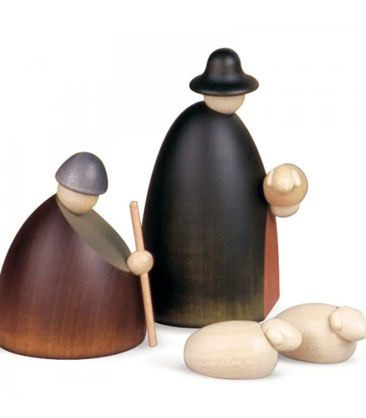 Personnages Crèche De Noël En Bois Peint.Le Berger Avec L’Agneau Dans Les Bras, Le Patre Et Les Moutons.