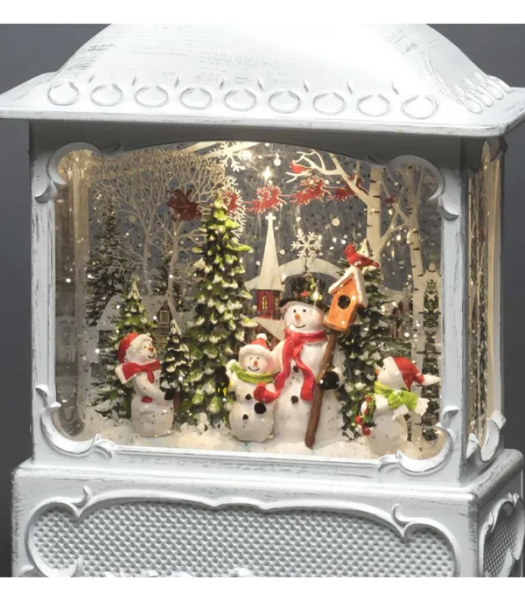 Grande Lanterne De Noël A Eau, 4 Bonshommes De Neige Avec Oiseaux, Couleur Blanc Antique, Hauteur 30 Cm.