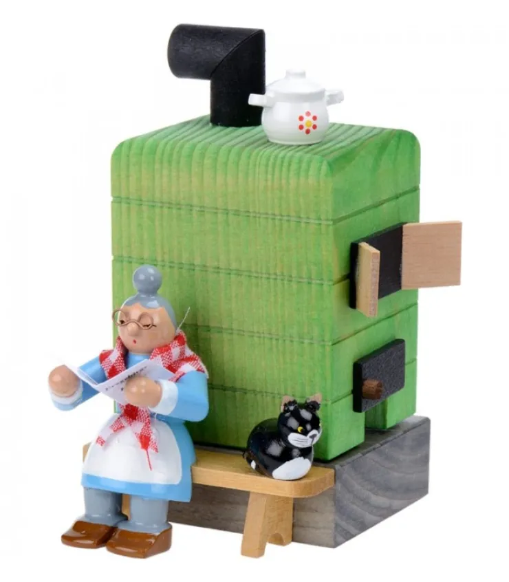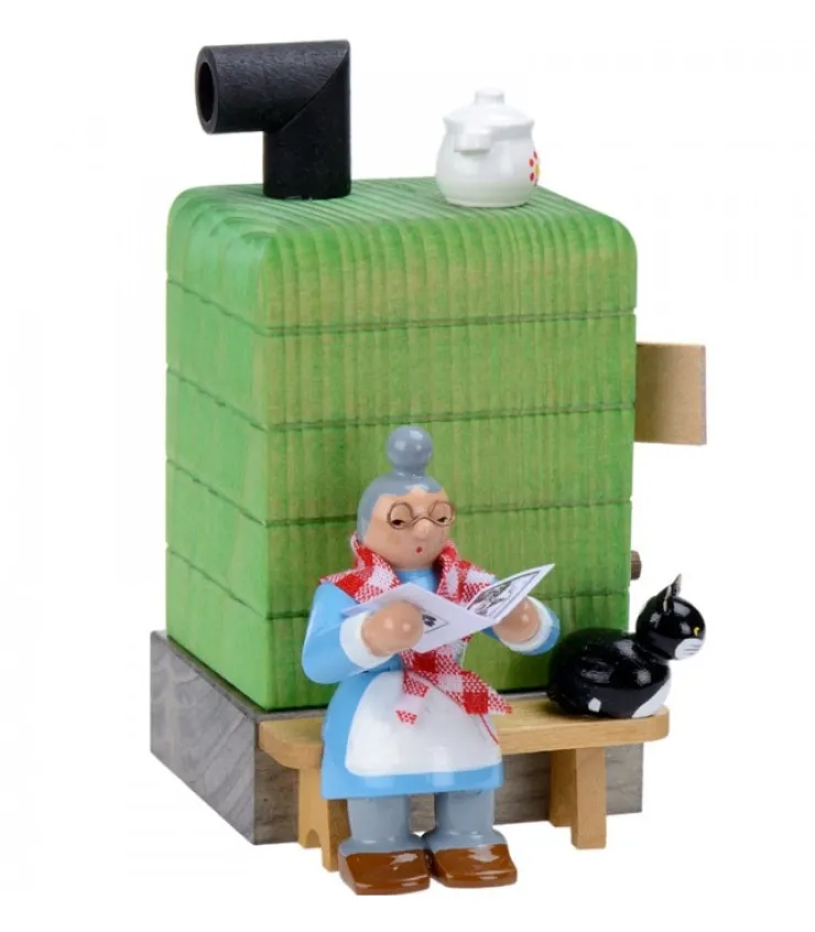 Brule Parfum En Bois Allemand.Poele En Faience Avec Grand-Mere Lisant Le Journal Et Chat.A Utiliser Avec Les Cones D’Enc…