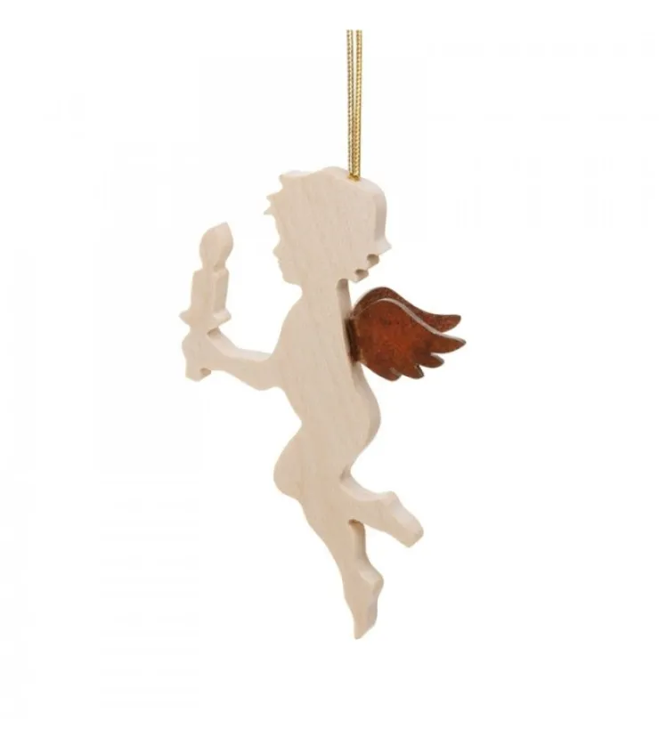Petit Ange Décoratif A Suspendre, En Bois D’Erable, Tenant Une Bougie Dans La Main.