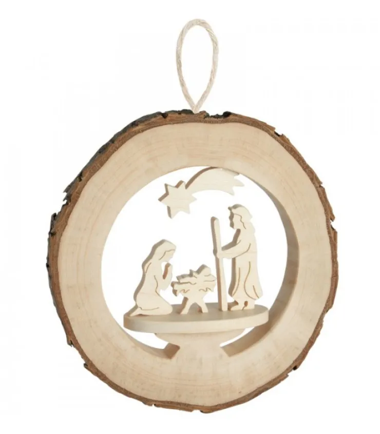 Crèche De Noël A Suspendre Dans Anneau De Bois, 10 Cm.