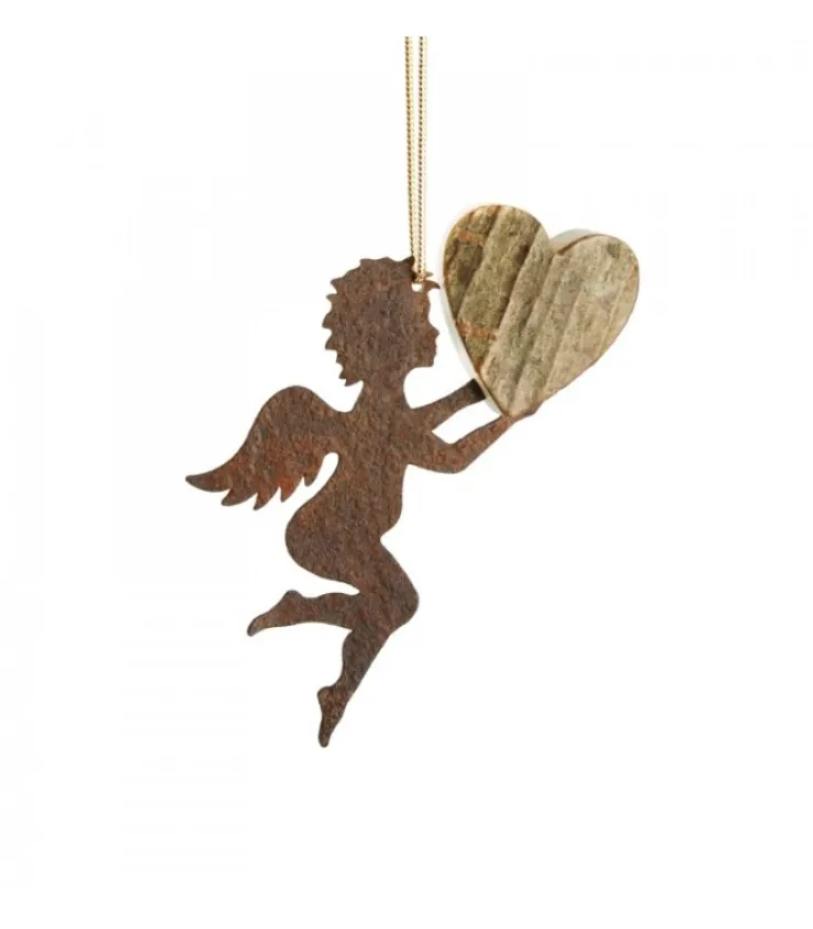 Petit Ange A Suspendre Au Sapin De Noël Tenant Un Coeur En Ecorce De Bois.Aspect Patine Metal Oxyde.Fourni Avec Une Cor…