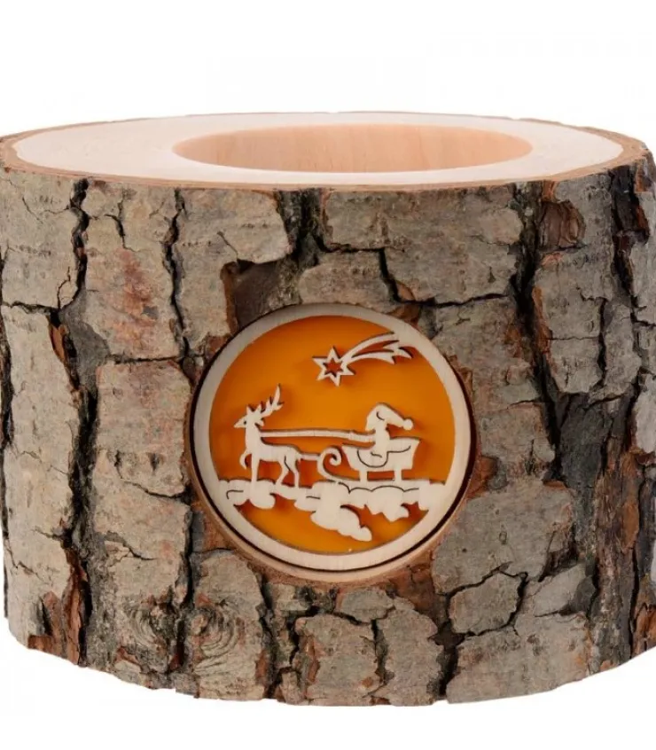 Bougeoir Photophore En Ecorce De Bois De Forme Ronde Dans Un Rondin De Bois Avec Un Motif Translucide D’Un Père Noël Sur Son Traineau Tire Par Des Rennes.